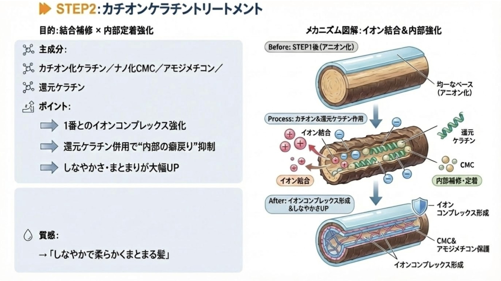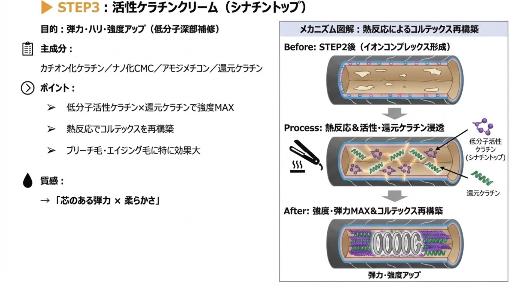 6種ケラチンを必要箇所へ結合。損傷・エイジング毛の補修。